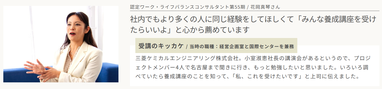 ちょうどその頃、そのプロジェクト内でワーク・ライフバランス社の小室淑恵社長の講演会があるというので、プロジェクトメンバー4人で名古屋まで聞きに行きまして。「もうこれ、やるしかない!」と目からうろこでした。もっと勉強したいと思いました。でも実際には何をしたらいいのか全くわからない状態。何とかしたいといろいろ調べていたら養成講座のことを知って、「私、これを受けたいです」と上司に伝えました。