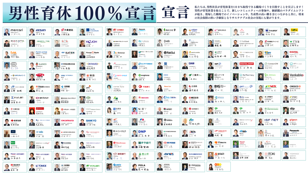 2019年3月より、男性も子どもを育てるための育児休業が取得できる組織作りに向け、経営者がコミットを表明する「男性育休100%宣言」の募集を開始したところ、2022年10月7日時点で153社が賛同を表明しています。「現在、自社内で男性の育児休業取得率100%の実現を目指して取り組んでいる」という組織や「今後、取得率をあげて、いずれは100%を目指したい」と考える組織の代表者などが宣言するとともに、各社で男性も育児休業取得ができる環境整備のための勉強会などを開催しています。