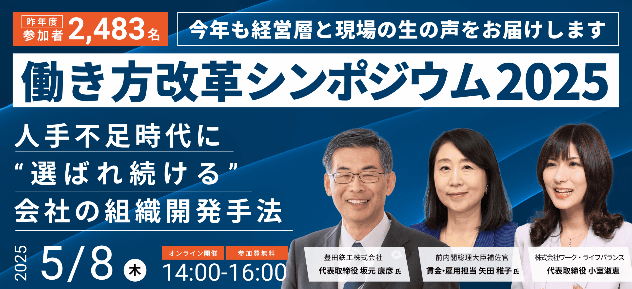 【プレスリリース】申込者数1,500名突破!「働き方改革シンポジウム2025」を25年5月8日にオンライン無料開催、矢田稚子前内閣総理大臣補佐官、社員幸福度向上を目指す豊田鉄工・坂元康彦社長が登壇~「人手不足時代に“選ばれ続ける”会社の組織開発手法」として小室淑恵が働き方改革最新情報を提供~