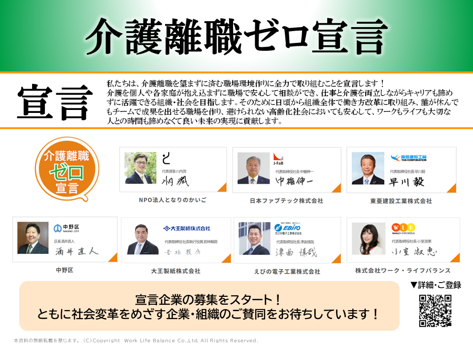 働く人が介護を個人で抱え込み離職してしまう現状を変え、「介護と仕事の両立が当たり前にできる社会」を実現するため、本宣言は職場で安心して相談できる環境づくりや、日常的な働き方改革を通じて“誰が休んでも成果が出せる職場”を広げることを目指す宣言です。