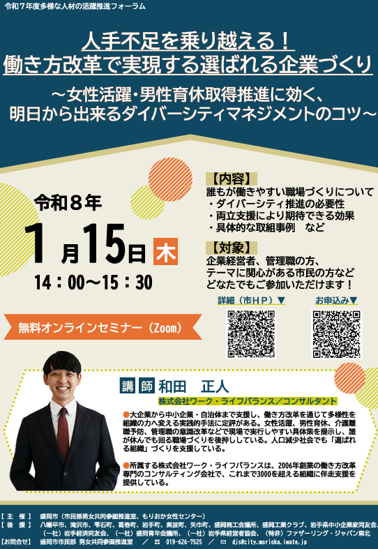 経営層・管理職・社員の意識改革が課題かもしれません。なぜ働き方改革が必要なのかをお伝えする研修の満足度は創業以来90%以上です。データを交え豊富な経験から、うまくいく方法や成功事例などをお伝えします。働き方改革が売上や生産性向上に寄与する経営戦略であることがご理解いただける講演です。