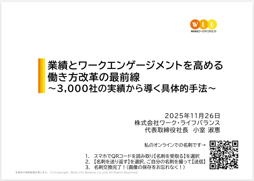 本資料は、2025年11月26日に弊社代表小室淑恵が登壇いたしましたバックオフィスDXPO内セミナー「業績とワークエンゲージメントを高める働き方改革の最前線 ~3,000社の実績から導く具体的手法~」の投影資料です。ご提供可能な部分抜粋版となりますので予めご了承ください。