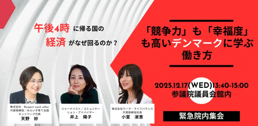 【メディア掲載】 2026年01月28日 『ログミーBusiness』 にて 「午後4時に帰る国の経済がなぜ回るのか?「競争力も幸福度も高い」デンマークに学ぶ働き方」 に、弊社代表取締役社長小室淑恵が参加した勉強会の記事が掲載されました! (全6記事公開!)