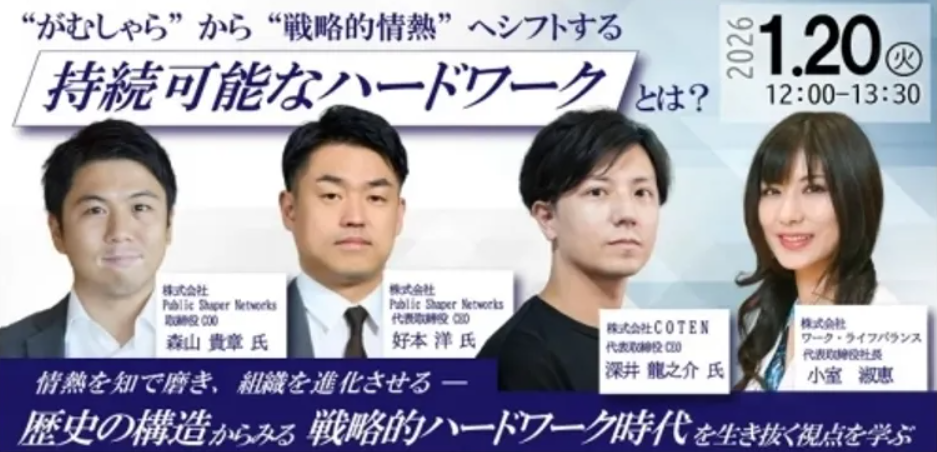 【メディア掲載】 2026年04月07日 『ログミーBusiness “がむしゃら”から“戦略的情熱”へシフトする「持続可能なハードワーク」とは? 第2弾!情熱を知で磨き、組織を進化させるー歴史の構造からみる、戦略的ハードワーク時代を生き抜く視点を学ぶ』 にて 「長時間労働型の組織で“優秀な才能”が埋もれてしまう理由 日本の歴史が繰り返す「戦略なき根性論」の罠 」 に、弊社代表取締役社長小室淑恵のインタビュー記事が掲載されました! (全3記事公開!)