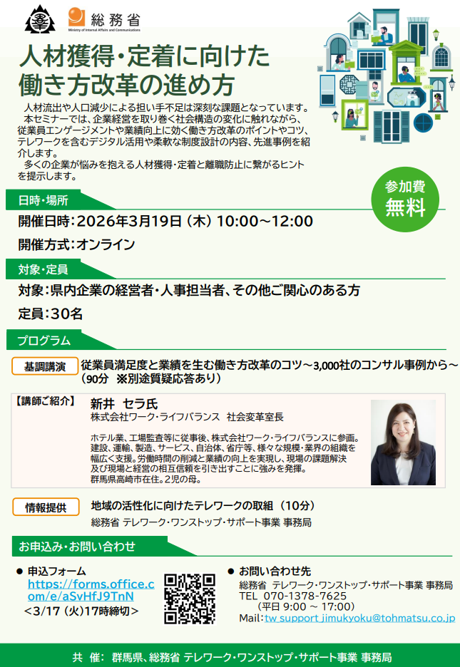 「人材獲得・定着に向けた働き方改革の進め方」にて弊社コンサルタント新井セラがコンサルタントが講師を務めます!