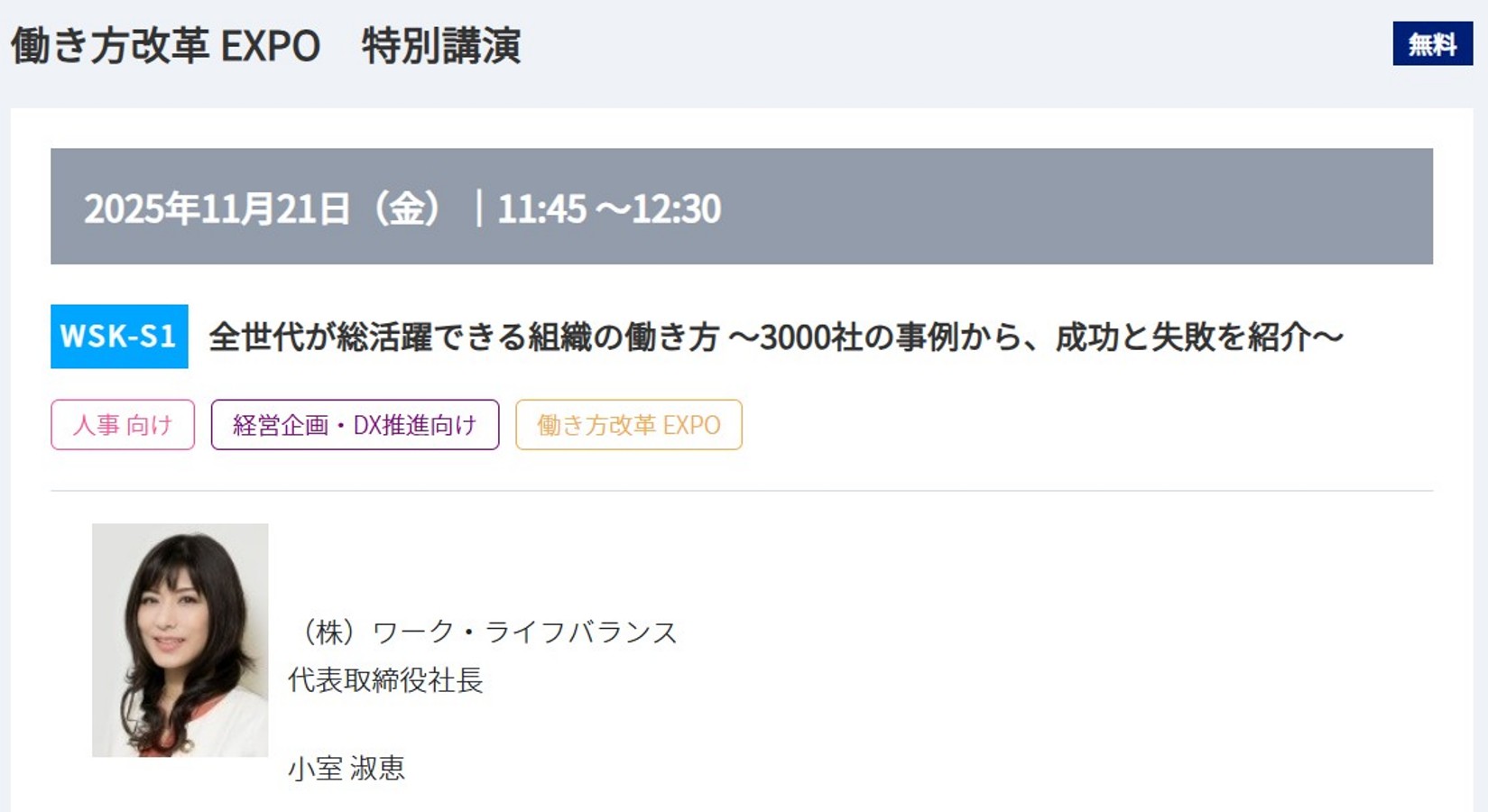 【参加者募集】 2025年11月21日(金)11:45~12:30総務・人事・経理WEEK「働き方改革 EXPO(関西)」の特別講演に弊社代表小室淑恵が登壇します!