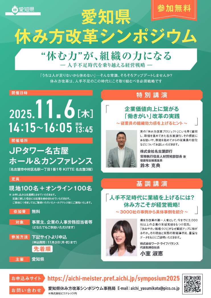 【参加者募集】 2025年11月6日(木) 14:15~16:05 愛知県「休み方改革シンポジウム」にて弊社代表取締役社長 小室淑恵が基調講演に登壇します!