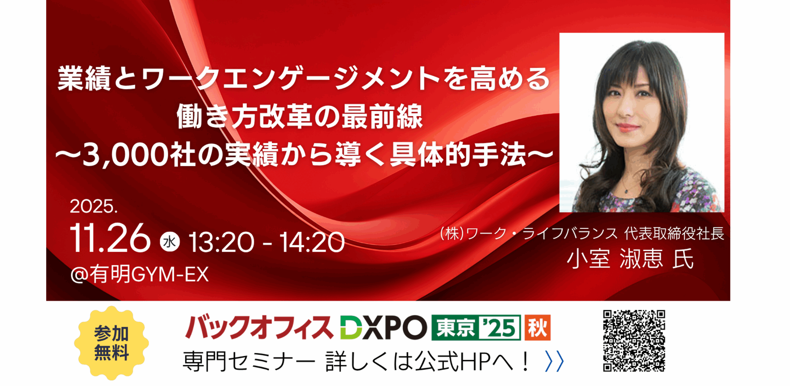 【参加者募集】2025年11月26日(水)13:20~14:20 バックオフィスDXPO東京’25【秋】「業績とワークエンゲージメントを高める働き方改革の最前線 ~3,000社の実績から導く具体的手法~」にて弊社代表取締役社長小室淑恵が登壇いたします!