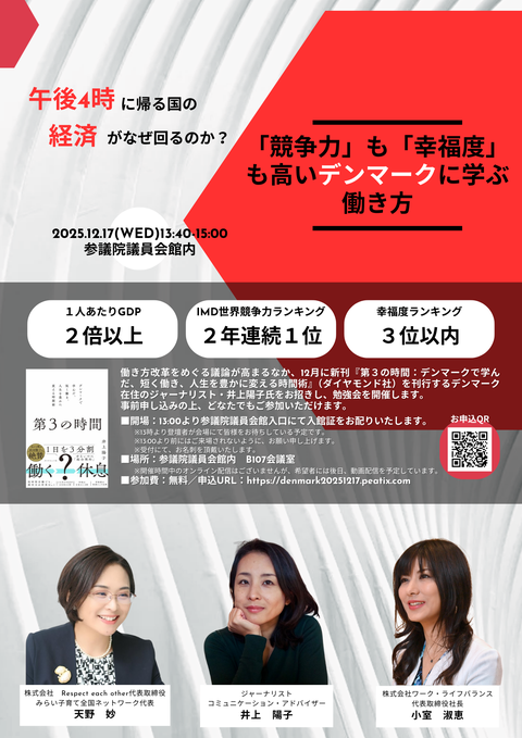 「午後4時に帰る国の経済がなぜ回るのか?「競争力も幸福度も高い」デンマークに学ぶ働き」に弊社代表の小室淑恵が登壇します!