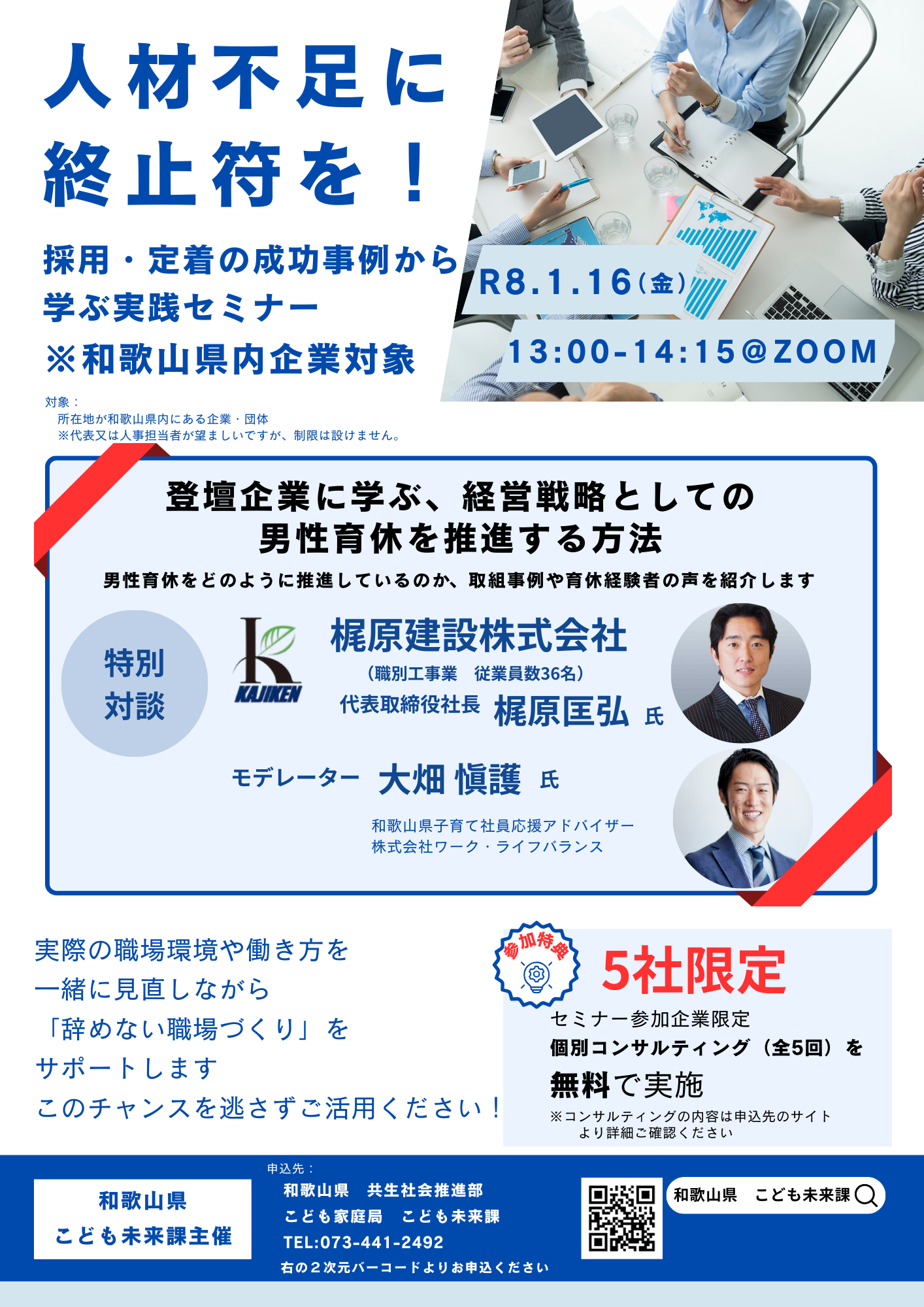 2026年1月16日(金)13:00~14:15 和歌山県 「人材不足に終止符を! 採用・定着の成功事例から学ぶ実践セミナー」 にて弊社コンサルタント大畑慎護がモデレーターを務めます!