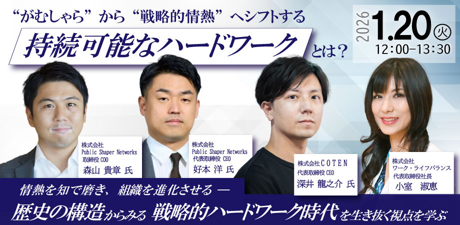 オンラインイベント“がむしゃら”から“戦略的情熱”へシフトする「持続可能なハードワーク」とは? 第2弾!情熱を知で磨き、組織を進化させるー歴史の構造からみる、戦略的ハードワーク時代を生き抜く視点を学ぶ