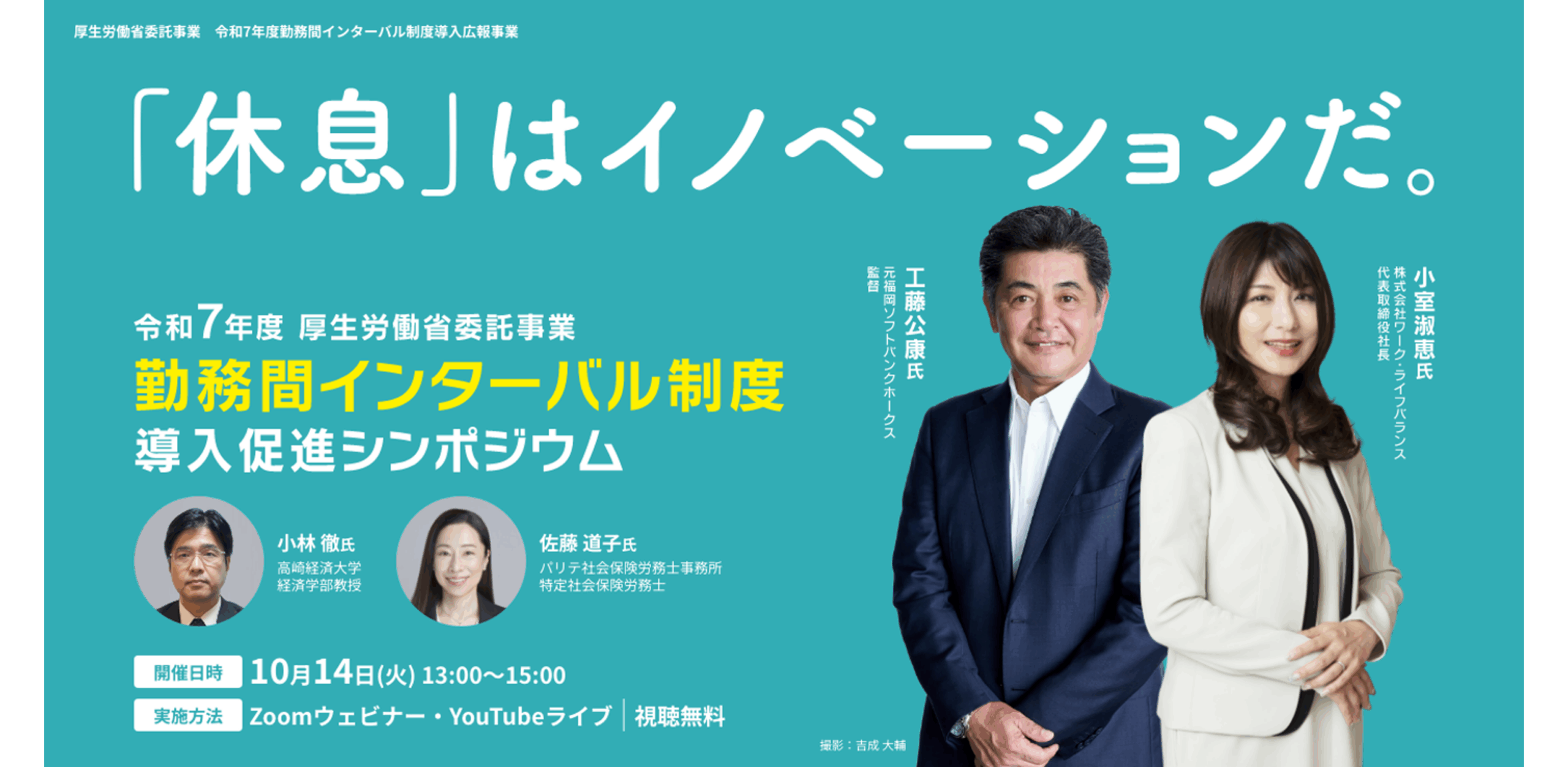 【参加者募集】 2025年10月14日(火) 13:00-15:00 令和7年度勤務間インターバル制度導入促進シンポジウムの基調講演に弊社代表小室淑恵が登壇します!