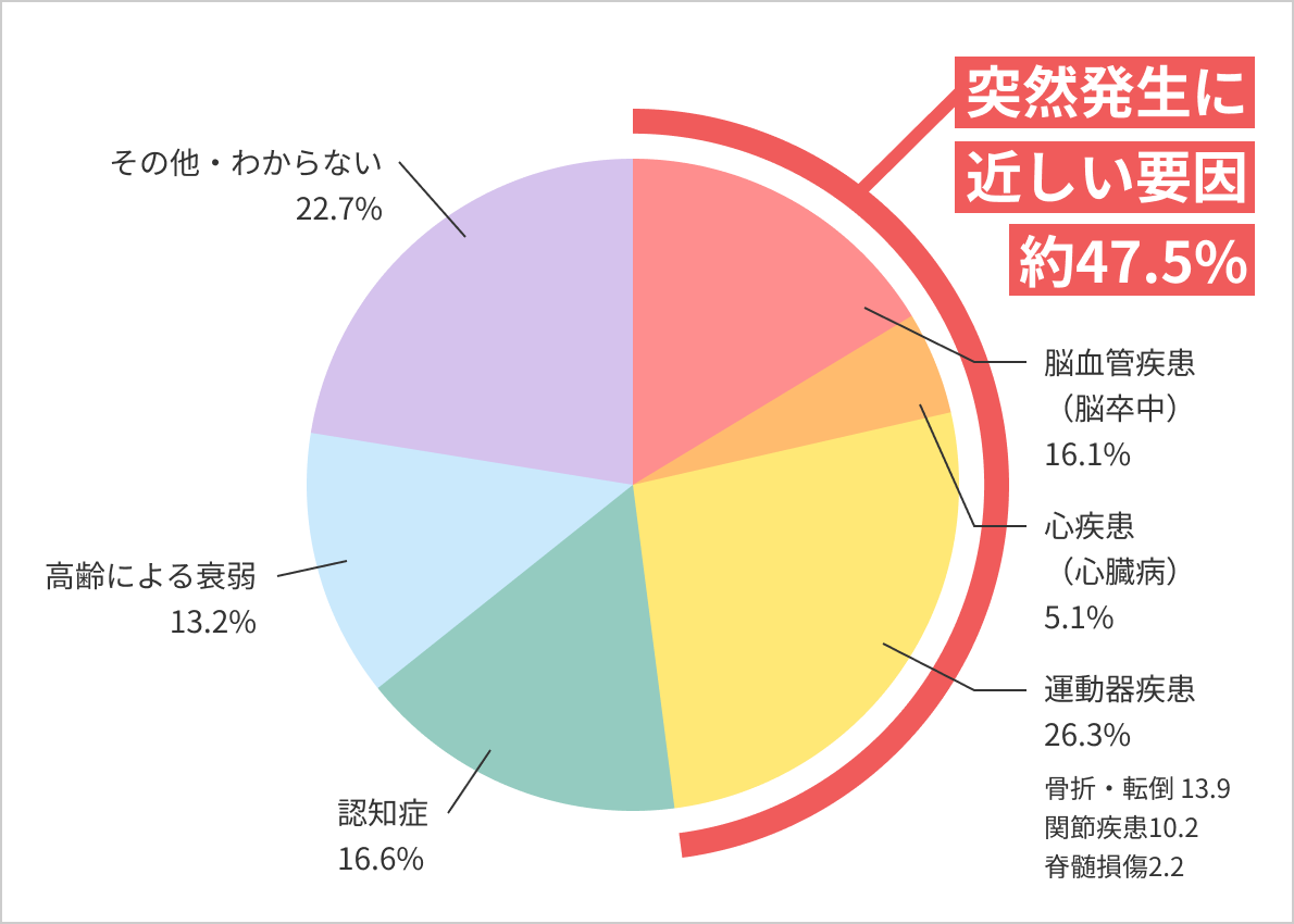 介護はだんだんと心身が衰えて始まるもの、というイメージが一般的かもしれませんが、実は今日倒れてこの瞬間から介護が必要、ということも意外に多いのです。