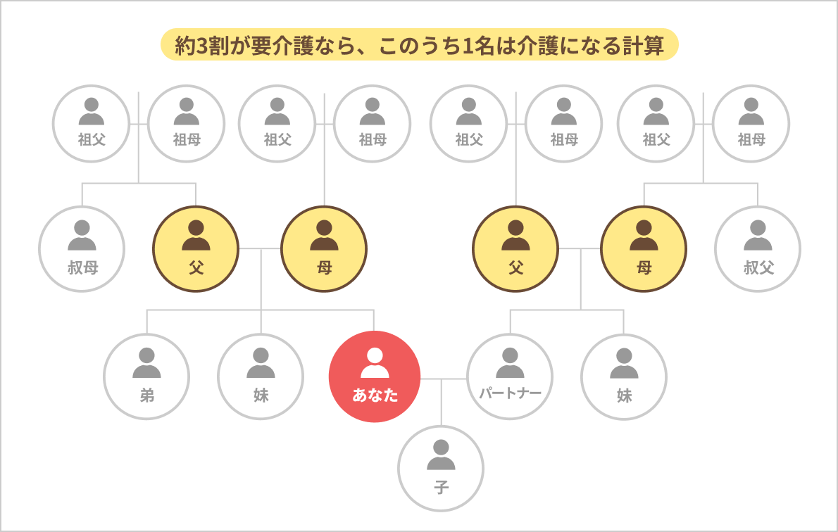 75歳以上になると大きく上がるのが要介護(要支援)認定の割合です。パートナーがいる方の場合は、自分とパートナーの親、祖父母、おじ・おばなど、介護に関わりうる方を家系図で書き出してみると、意外と介護はもうすぐそこかもしれない、ということがわかります。年齢や持病の有無、体調の様子などを書き出してみることがおすすめです。