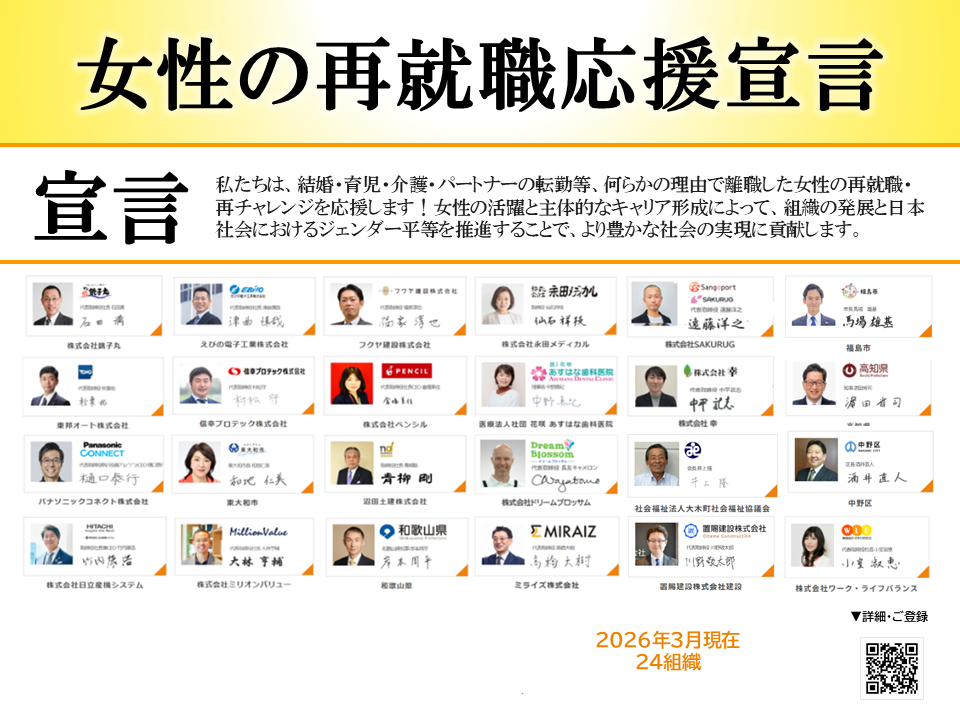 こうした社会背景の中、経済界をあげて女性の再就職を後押しすることで、誰もがそれぞれのフィールドで活躍する社会の実現をしていくために、女性の再チャレンジを応援することを、組織のトップが宣言する特設ページを開設いたします。